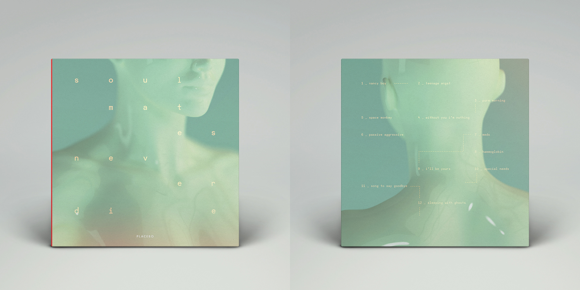 The students were asked to choose a musician or a band and after extensive research, to create an idntity for the last album that will be released after the death of that musician. I chose the band "Placebo". In my story Brian Molko died unexpectedly and the foundation for this design is his relationship with Stefan Olsdal. For me, the main motif of this project was the sense of losing someone close to you. // Guidance: Zohar Koren